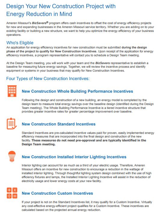 As an Ameren Missouri Trade Ally, CTS Group can aid in receiving of cash incentives to offset the cost of energy efficiency projects for new and expanding facilities. Whether you are adding on to your existing facility or constructing a new structure, we want to help you optimize the energy efficiency of your operations.